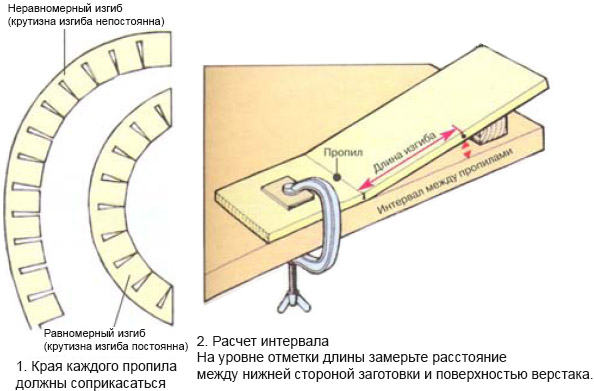 Ширина пропилов зависит от используемой пилы. Тонкая пила дает узкий пропил, а пила с крупными зубьями - широкий пропил. Ширина пропилов и их расположение имеют прямое влияние на радиус закругления. Тонких пропилов потребуется больше, чем широких для получения одного и того же радиуса, близко расположенные пропилы дают более правильную форму изгиба. Однако лицевая сторона, как правило, становится слегка «граненой», и приходится зашлифовывать изгиб для получения плавности изгиба.