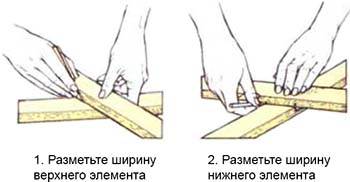 Косое соединение вполдерева вырезается так же, как и обычное поперечное соединение, но вырезы выполняются под углом. Главное различие заключается в разметке заплечиков.