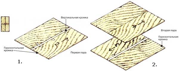 Этот метод - разновидность набора книжкой. Возьмите четыре последовательных листа шпона из стоики и найдите место, где «фокусируется» узор. Возьмите первую пару и соедините вертикальные кромки по методу книжки. Чтобы получилась хорошая подгонка, сначала выровняйте кромку соединения одного листа. Положите выровненный край на ответную кромку второго листа, выровняйте узор, ровно обрежьте второй лист и склейте соединение клеящей лентой (1). Затем ровно срежьте горизонтальную кромку.