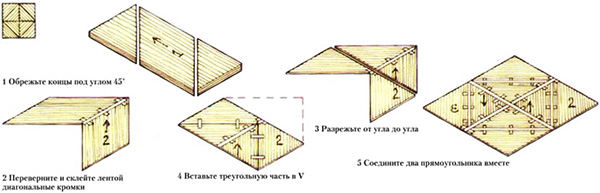 В ромбическом наборе применяется шпон с полосчатым узором. Четыре последовательных листа в стопке шпона положите вместе и выровняйте две длинные кромки. Срежьте оба конца под углом 45' параллельно друг к другу (1). Раскройте два верхних листа по методу книжки, но поверните их вокруг верхней диагональной кромки так, чтобы образовалась перевернутая буква V, затем склейте соединение лентой (2). После этого сделайте прямой горизонтальный разрез от угла до угла (3). Треугольную часть вставьте в V снизу, чтобы получился прямоугольник (4). Потом повторите процесс со второй парой листов шпона, но сначала переверните их лицевой стороной вниз, как в случае набора из четырех частей. Затем соедините два прямоугольника по центру (5).