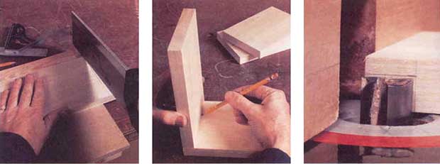 | 1. Начните с подготовки дерева для основания и вертикальных панелей. Убедитесь, что оно имеет одинаковую толщину, что все его стороны оструганы и параллельны. Измерьте дерево, отпилите доски нужной длины ножовкой. | 2 Вертикальная панель устанавливается в паз, прорезанный в основании. Простейший способ разметить его - поставить панель вертикально на основание, выровняв края. Острым карандашом нанесите на основание требуемую ширину паза. Обозначьте глубину паза - она должна быть не меньше 12 мм. | 3. Прорезать паз на небольшой доске удобнее всего с помощью стола для фрезера. Возьмите прямозубую цилиндрическую фрезу и расположите ее. как показано на снимке. Бортик- упор установлен так, что фреза лишь касается метки, соответствующей ширине паза, а высота задана таким образом, чтобы фреза не опускалась ниже предполагаемой глубины паза. Сделайте несколько неглубоких пропилов, пока не добьетесь нужной глубины. Чтобы избежать появления разломов, полезно подложить под обрабатываемую деталь еще одну доску. |